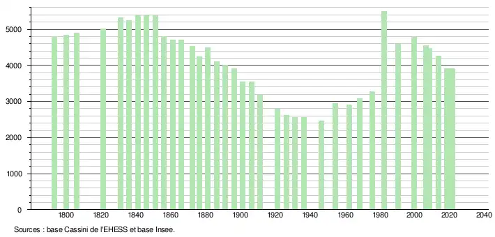 L'évolution du nombre d'habitants est connue à travers les recensements de la population effectués dans la commune depuis 1793. Pour les communes de moins de 10 000 habitants, une enquête de recensement portant sur toute la population est réalisée tous les cinq ans, les populations légales des années intermédiaires étant quant à elles estimées par interpolation ou extrapolation[31]. Pour la commune, le premier recensement exhaustif entrant dans le cadre du nouveau dispositif a été réalisé en 2008[32].