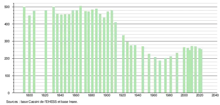 L'évolution du nombre d'habitants est connue à travers les recensements de la population effectués dans la commune depuis 1793. Pour les communes de moins de 10 000 habitants, une enquête de recensement portant sur toute la population est réalisée tous les cinq ans, les populations légales des années intermédiaires étant quant à elles estimées par interpolation ou extrapolation[15]. Pour la commune, le premier recensement exhaustif entrant dans le cadre du nouveau dispositif a été réalisé en 2004[16].