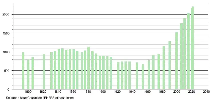 L'évolution du nombre d'habitants est connue à travers les recensements de la population effectués dans la commune depuis 1793. Pour les communes de moins de 10 000 habitants, une enquête de recensement portant sur toute la population est réalisée tous les cinq ans, les populations légales des années intermédiaires étant quant à elles estimées par interpolation ou extrapolation[24]. Pour la commune, le premier recensement exhaustif entrant dans le cadre du nouveau dispositif a été réalisé en 2005[25].