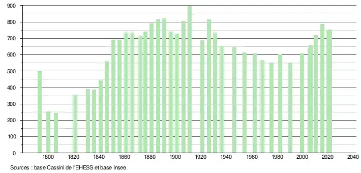 L'évolution du nombre d'habitants est connue à travers les recensements de la population effectués dans la commune depuis 1793. Pour les communes de moins de 10 000 habitants, une enquête de recensement portant sur toute la population est réalisée tous les cinq ans, les populations légales des années intermédiaires étant quant à elles estimées par interpolation ou extrapolation[17]. Pour la commune, le premier recensement exhaustif entrant dans le cadre du nouveau dispositif a été réalisé en 2005[18].
