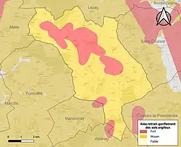 Les mouvements de terrains susceptibles de se produire sur la commune sont des tassements différentiels[16]. Le retrait-gonflement des sols argileux est susceptible d'engendrer des dommages importants aux bâtiments en cas d’alternance de périodes de sécheresse et de pluie[17]. La totalité de la commune est en aléa moyen ou fort (54,9 % au niveau départemental et 48,5 % au niveau national)[Carte 2]. Depuis le , en application de la loi ELAN, différentes contraintes s'imposent aux vendeurs, maîtres d'ouvrages ou constructeurs de biens situés dans une zone classée en aléa moyen ou fort[Note 3],[18].
