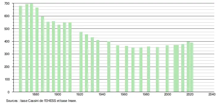 L'évolution du nombre d'habitants est connue à travers les recensements de la population effectués dans la commune depuis 1866. Pour les communes de moins de 10 000 habitants, une enquête de recensement portant sur toute la population est réalisée tous les cinq ans, les populations légales des années intermédiaires étant quant à elles estimées par interpolation ou extrapolation[37]. Pour la commune, le premier recensement exhaustif entrant dans le cadre du nouveau dispositif a été réalisé en 2008[38].