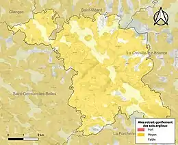 Le retrait-gonflement des sols argileux est susceptible d'engendrer des dommages importants aux bâtiments en cas d’alternance de périodes de sécheresse et de pluie[17]. 78,4 % de la superficie communale est en aléa moyen ou fort (27 % au niveau départemental et 48,5 % au niveau national métropolitain)[Carte 2]. Depuis le , en application de la loi ÉLAN, différentes contraintes s'imposent aux vendeurs, maîtres d'ouvrages ou constructeurs de biens situés dans une zone classée en aléa moyen ou fort[Note 3],[18].