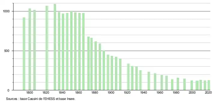 L'évolution du nombre d'habitants est connue à travers les recensements de la population effectués dans la commune depuis 1793. Pour les communes de moins de 10 000 habitants, une enquête de recensement portant sur toute la population est réalisée tous les cinq ans, les populations légales des années intermédiaires étant quant à elles estimées par interpolation ou extrapolation[11]. Pour la commune, le premier recensement exhaustif entrant dans le cadre du nouveau dispositif a été réalisé en 2005[12].