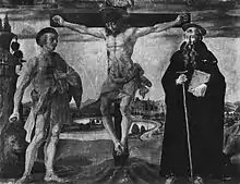 - Saint Jérôme, représenté sous les traits du pénitent, il tient dans sa main droite la pierre avec laquelle il se frappe la poitrine.