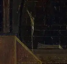 - trois éléments repoussés dans l'ombre : le chat, avatar du Diable, à connotations sexuelles, la lampe éteinte, allusion aux dix vierges qui durent s'accoupler avec le Démon quand, l'huile leur faisant défaut, elles furent plongées dans l'obscurité - dans la parabole des Vierges folles de l'Évangile selon Matthieu[22], citée par saint Jérôme dans sa lettre -, et enfin, la serviette souillée, symbole inversé de la virginité de Marie;