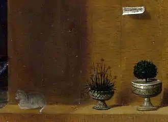 - l'arbuste en pot serait une « version d'intérieur » du « Jardin clos » de la Vierge, métaphore de sa virginité, et qui se retrouve dans L’Annonciation de Syracuse
