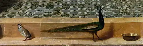 Les bords du tableau représentent l'encadrement d'une porte (ou d'une fenêtre) de marbre veiné, en arc segmentaire de style catalan, par laquelle on accède à un vaste intérieur, palais ou cathédrale. Sur la marche figurée en bas du tableau, au premier plan, se trouvent, de gauche à droite, une perdrix selon son profil gauche, un paon selon son profil droit, et une bassine de cuivre remplie d'eau.