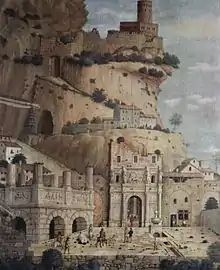 Les ruines antiques constituent un décor classique des tableaux de Mantegna. Le chemin escarpé, les graviers et les grottes font référence à la difficulté d’atteindre la Jérusalem céleste, la ville fortifiée au sommet de la montagne, au coin supérieur droit de l’image, décrite au chapitre 21 de l’Apocalypse de saint Jean.