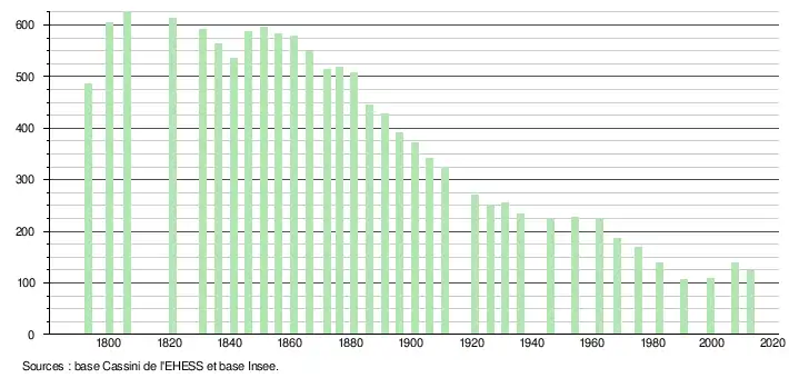 L'évolution du nombre d'habitants est connue à travers les recensements de la population effectués dans la commune depuis 1793. À partir du , les populations légales des communes sont publiées annuellement dans le cadre d'un recensement qui repose désormais sur une collecte d'information annuelle, concernant successivement tous les territoires communaux au cours d'une période de cinq ans. Pour les communes de moins de 10 000 habitants, une enquête de recensement portant sur toute la population est réalisée tous les cinq ans, les populations légales des années intermédiaires étant quant à elles estimées par interpolation ou extrapolation[4]. Pour la commune, le premier recensement exhaustif entrant dans le cadre du nouveau dispositif a été réalisé en 2007[5],[Note 1].