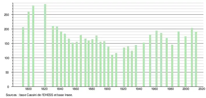 L'évolution du nombre d'habitants est connue à travers les recensements de la population effectués dans la commune depuis 1793. À partir du , les populations légales des communes sont publiées annuellement dans le cadre d'un recensement qui repose désormais sur une collecte d'information annuelle, concernant successivement tous les territoires communaux au cours d'une période de cinq ans. Pour les communes de moins de 10 000 habitants, une enquête de recensement portant sur toute la population est réalisée tous les cinq ans, les populations légales des années intermédiaires étant quant à elles estimées par interpolation ou extrapolation[8]. Pour la commune, le premier recensement exhaustif entrant dans le cadre du nouveau dispositif a été réalisé en 2007[9],[Note 2].