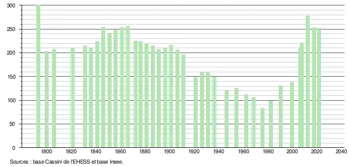 L'évolution du nombre d'habitants est connue à travers les recensements de la population effectués dans la commune depuis 1793. Pour les communes de moins de 10 000 habitants, une enquête de recensement portant sur toute la population est réalisée tous les cinq ans, les populations légales des années intermédiaires étant quant à elles estimées par interpolation ou extrapolation[22]. Pour la commune, le premier recensement exhaustif entrant dans le cadre du nouveau dispositif a été réalisé en 2007[23].