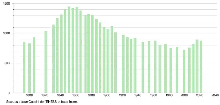 | L'évolution du nombre d'habitants est connue à travers les recensements de la population effectués dans la commune depuis 1793. Pour les communes de moins de 10 000 habitants, une enquête de recensement portant sur toute la population est réalisée tous les cinq ans, les populations légales des années intermédiaires étant quant à elles estimées par interpolation ou extrapolation[30]. Pour la commune, le premier recensement exhaustif entrant dans le cadre du nouveau dispositif a été réalisé en 2006[31]. En 2021, la commune comptait 872 habitants[Note 6], en diminution de 0,91 % par rapport à 2015 (Tarn : +1,82 %, France hors Mayotte : +1,84 %). |