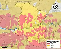 La commune est vulnérable au risque de mouvements de terrains constitué principalement du retrait-gonflement des sols argileux[25]. Cet aléa est susceptible d'engendrer des dommages importants aux bâtiments en cas d’alternance de périodes de sécheresse et de pluie. 97,6 % de la superficie communale est en aléa moyen ou fort (76,3 % au niveau départemental et 48,5 % au niveau national). Sur les 448 bâtiments dénombrés sur la commune en 2019, 446 sont en aléa moyen ou fort, soit 100 %, à comparer aux 90 % au niveau départemental et 54 % au niveau national. Une cartographie de l'exposition du territoire national au retrait gonflement des sols argileux est disponible sur le site du BRGM[26],[Carte 3].