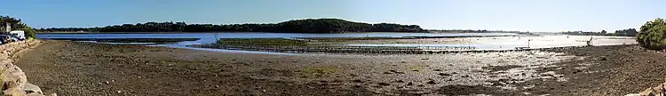 La rivière d'Étel prend sa source près du village de Penhoët, dans l'est de la commune de Languidic, dans le Morbihan, à environ 100 m d'altitude. L'embouchure se situe dans l'océan Atlantique au niveau de la ville d'Étel et de celle de Plouhinec. Sa longueur totale est de 35,1 km[5]. Sa partie nord-ouest, qui concerne la commune de Sainte-Hélène, se subdivise en plusieurs bras, le Chenal de Berringue et la Rivière de Landévant étant les principaux. Découvrant largement à marée basse, le littoral très indenté s'étend sur 13 kilomètres, alternant petites criques sablonneuses et pointes rocheuses ; il est formé principalement de vasières (par exemple la Vassière du Couarde) utilisées par des ostréiculteurs pour y implanter leurs parcs à huîtres.