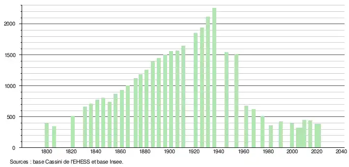 L'évolution du nombre d'habitants est connue à travers les recensements de la population effectués dans la commune depuis 1800. Pour les communes de moins de 10 000 habitants, une enquête de recensement portant sur toute la population est réalisée tous les cinq ans, les populations légales des années intermédiaires étant quant à elles estimées par interpolation ou extrapolation[8]. Pour la commune, le premier recensement exhaustif entrant dans le cadre du nouveau dispositif a été réalisé en 2004[9].