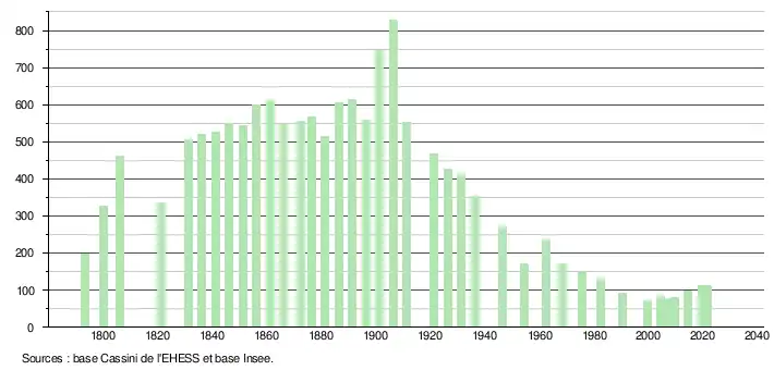 L'évolution du nombre d'habitants est connue à travers les recensements de la population effectués dans la commune depuis 1793. Pour les communes de moins de 10 000 habitants, une enquête de recensement portant sur toute la population est réalisée tous les cinq ans, les populations légales des années intermédiaires étant quant à elles estimées par interpolation ou extrapolation[15]. Pour la commune, le premier recensement exhaustif entrant dans le cadre du nouveau dispositif a été réalisé en 2004[16].