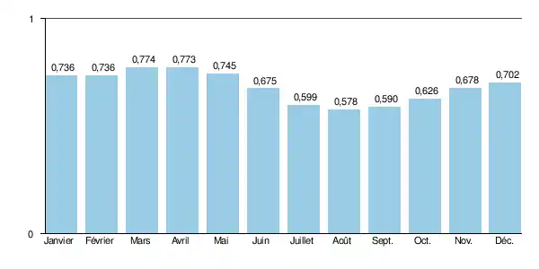La Sainte-Marie présente des fluctuations saisonnières de débit extrêmement modérées. À l'instar de l'Automne, il est bien difficile de parler de hautes et de basses eaux pour ce cours d'eau étonnamment régulier. Disons que les débits mensuels moyens sont légèrement plus importants à la fin de l'hiver et au début du printemps. Ils oscillent entre 0,736 et 0,774 m3/s, de janvier à mai inclus (avec un maximum en mars et en avril). En juin le débit baisse doucement ce qui mène à une période de "basses eaux" qui a lieu de juillet à octobre inclus, avec un plancher de 0,578 m3/s au mois d'août[2], ce qui est encore franchement abondant, pour un aussi petit cours d'eau. Cependant les fluctuations de débit peuvent être plus importantes selon les années et sur de courtes périodes.