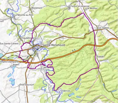 Sainte-Menehould est limitrophe de huit autres communes situées dans les départements de la Marne à l'ouest et de la Meuse à l'est[G 1]: