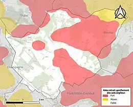 Le retrait-gonflement des sols argileux est susceptible d'engendrer des dommages importants aux bâtiments en cas d’alternance de périodes de sécheresse et de pluie. 47,1 % de la superficie communale est en aléa moyen ou fort (54,2 % au niveau départemental et 48,5 % au niveau national). Sur les 267 bâtiments dénombrés sur la commune en 2019, 123 sont en aléa moyen ou fort, soit 46 %, à comparer aux 57 % au niveau départemental et 54 % au niveau national. Une cartographie de l'exposition du territoire national au retrait gonflement des sols argileux est disponible sur le site du BRGM[14],[Carte 2].