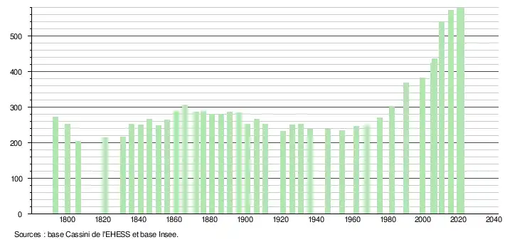 L'évolution du nombre d'habitants est connue à travers les recensements de la population effectués dans la commune depuis 1793. Pour les communes de moins de 10 000 habitants, une enquête de recensement portant sur toute la population est réalisée tous les cinq ans, les populations légales des années intermédiaires étant quant à elles estimées par interpolation ou extrapolation[17]. Pour la commune, le premier recensement exhaustif entrant dans le cadre du nouveau dispositif a été réalisé en 2005[18].