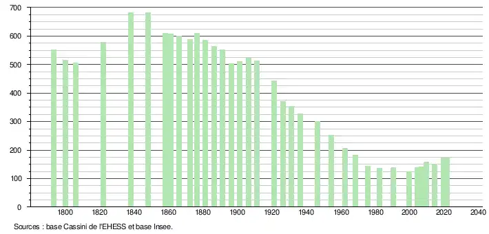 L'évolution du nombre d'habitants est connue à travers les recensements de la population effectués dans la commune depuis 1793. Pour les communes de moins de 10 000 habitants, une enquête de recensement portant sur toute la population est réalisée tous les cinq ans, les populations légales des années intermédiaires étant quant à elles estimées par interpolation ou extrapolation[8]. Pour la commune, le premier recensement exhaustif entrant dans le cadre du nouveau dispositif a été réalisé en 2004[9].