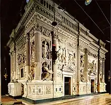 Véritable maison Renaissance sur le modèle des sarcophages romains entourant l'antique maison sainte en briques, c’est Bramante qui en conçoit le plan. Léon X fait venir par mer en 1514 de Carrare et d’autres lieux d’Italie le marbre propre à sa construction.