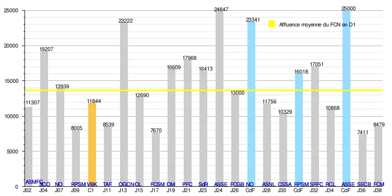 - de 259 310 spectateurs en 19 rencontres de Division 1, soit une moyenne de 13 648/match.