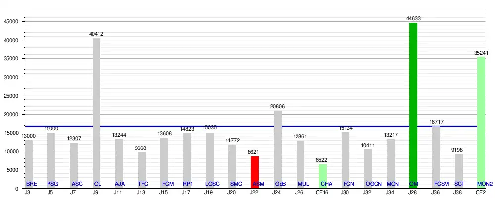 En championnat uniquement, la moyenne est de 16 340 sur les 19 rencontres avec 310 467 spectateurs