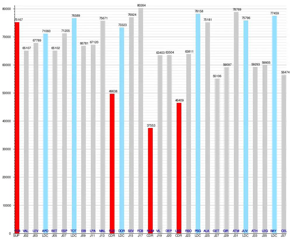 | 2 | Atlético de Madrid C3 | 79 | 38 | 5 | +36 |