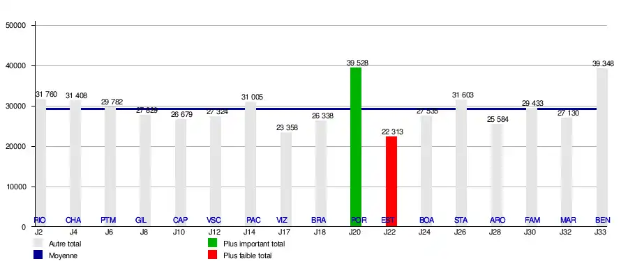 Ce graphique représente le nombre de spectateurs présents au Stade José Alvalade XXI lors de chaque match à domicile.