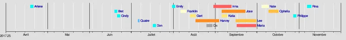 La saison a en réalité débuté le avec la tempête tropicale Arlene. Il y eut peu de cyclones tropicaux avant le mois d'août mais ensuite dix ouragans se succédèrent rapidement jusqu'au milieu d'octobre, dont six ouragans majeurs. Les plus marquants furent Harvey, Irma, Maria et Ophelia qui firent au moins 200 milliards de dollars américains en dégâts et plus de 3300 morts, dont un bilan officiel à Porto Rico pour Maria de 2975 morts[1]. Après la mi-octobre, l'activité est devenue dispersée avec des tempêtes tropicales de courtes durées et s'est terminée le avec Rina. L'énergie cumulative des cyclones tropicaux (ACE) pour la saison 2017 au était de 223,23 unités. C'est l'une des valeurs les plus élevées enregistrées pour une saison des ouragans dans l'Atlantique et le plus grand total depuis la saison 2005.