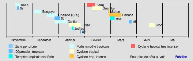 La saison a démarré plutôt dans les normes, le 12 novembre, avec la zone perturbée 01 se formant à environ 1000 km à l'Est de l'archipel de Diego Garcia. 01 est devenue une dépression tropicale le lendemain puis s'est intensifiée en une tempête tropicale modérée pour devenir le premier système de la saison. Le 15 novembre, Alicia atteignait son pic d'intensité en devenant une forte tempête tropicale avec des vents de 100 km/h et une pression de 982 hPa.