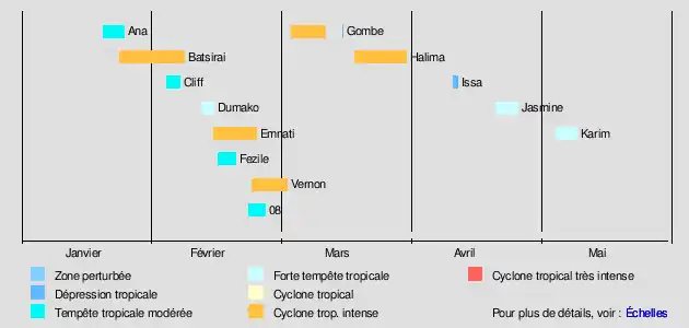 Mars a débuté par la tempête tropicale Gombe se formant au large de Madagascar. Frappant ce pays avant d'émerger dans le canal du Mozambique pour y devenir un cyclone équivalent d'un ouragan de catégorie 3, elle laissa au Mozambique de fortes pluies dans la même région frappée par Ana en janvier. Ensuite, Halima s'est formée au nord-est du bassin le et est devenue un cyclone tropical intense le , avant de se dissiper le sans jamais toucher de terres.
