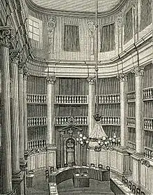 La salle se présente sous une forme elliptique, ceint de trois étages de balcons[30]. Un grand lustre est présent dans la salle qui met en évidence un style architectural néoclassique. Ce dernier est caractérisé par des colonnes d'ordre corinthien[31].