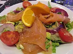 Salade californienne, avec salade, tomate, avocat, saumon, crevette, orange, vinaigrette. | |