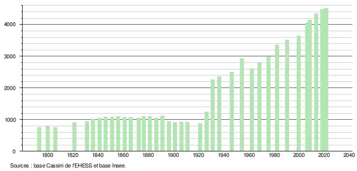 L'évolution du nombre d'habitants est connue à travers les recensements de la population effectués dans la commune depuis 1793. Pour les communes de moins de 10 000 habitants, une enquête de recensement portant sur toute la population est réalisée tous les cinq ans, les populations légales des années intermédiaires étant quant à elles estimées par interpolation ou extrapolation[20]. Pour la commune, le premier recensement exhaustif entrant dans le cadre du nouveau dispositif a été réalisé en 2008[21].