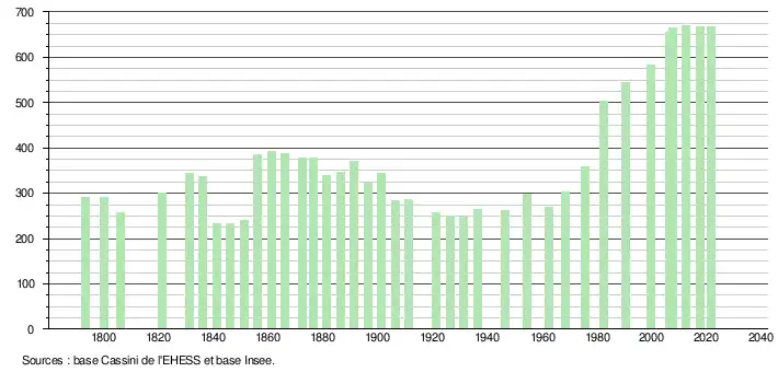 L'évolution du nombre d'habitants est connue à travers les recensements de la population effectués dans la commune depuis 1793. Pour les communes de moins de 10 000 habitants, une enquête de recensement portant sur toute la population est réalisée tous les cinq ans, les populations légales des années intermédiaires étant quant à elles estimées par interpolation ou extrapolation[16]. Pour la commune, le premier recensement exhaustif entrant dans le cadre du nouveau dispositif a été réalisé en 2007[17].