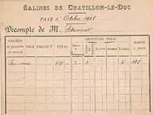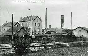 Une concession d'exploitation d'un gisement de sel est accordée, par décret le , à Jules Hunebelle, Camille Suleau et Joseph Musselin. La société anonyme des Mines de sel gemme et Salines de Châtillon-le-Duc est constituée en . Les associés font construire un bâtiment en 1877-1878. Implanté sur la commune de Geneuille[5], en bordure de la voie ferrée à laquelle il est reliée par un embranchement particulier, l'établissement comprend, outre les ateliers d'évaporation, une maison pour le concierge, un bâtiment des chaudières, machines et réparations et un château d'eau. Deux cheminées sont érigées : une de 29 mètres (section carrée) et une de 40 mètres (ronde)[4].
