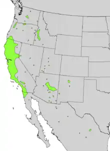L'espèce est présente dans la majorité de la Californie, y compris la côte, Klamath Mountains, Peninsular Ranges, Sierra Nevada, et Transverse Ranges[12],[11]. Elle s'étend au nord jusqu'à l'état de Washington, au sud vers Baja California, et à l'est, dans l'Idaho, Utah, Texas, et Coahuila (au Mexique)[1],[8].