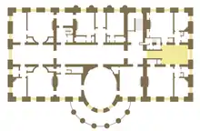 On entre dans la pièce par le couloir du deuxième étage du côté gauche (Nord) de la salle. Une large fenêtre-lunette à droite (côté est de la pièce) donne sur le Jacqueline Kennedy Garden (en) et sur la colonnade menant à l'aile Est de la Maison-Blanche, avec en arrière-plan le bâtiment du Trésor qui abrite le Département du Trésor des États-Unis (équivalent du ministère des Finances). Dans la pièce, deux portes dissimulées ouvrent sur un placard et à un escalier montant jusqu'au troisième étage.