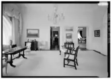 Sister Parish (en), le premier architecte d'intérieur convié par Jacqueline Kennedy lors de la restauration de la Maison-Blanche entrepris sous la présidence de son mari (1961 à 1963), transforma la Salle de séjour Est en la redécorant et en accueillant des meubles et des souvenirs associés à la vie du Président James Monroe (1817 à 1825).