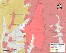 Le retrait-gonflement des sols argileux est susceptible d'engendrer des dommages importants aux bâtiments en cas d’alternance de périodes de sécheresse et de pluie. 92,1 % de la superficie communale est en aléa moyen ou fort (67,4 % au niveau départemental et 48,5 % au niveau national). Sur les 210 bâtiments dénombrés sur la commune en 2019, 191 sont en aléa moyen ou fort, soit 91 %, à comparer aux 81 % au niveau départemental et 54 % au niveau national. Une cartographie de l'exposition du territoire national au retrait gonflement des sols argileux est disponible sur le site du BRGM[18],[Carte 3].