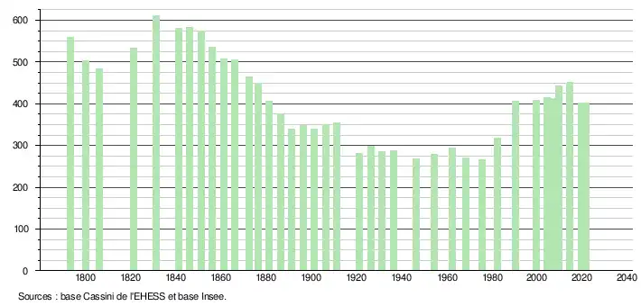 L'évolution du nombre d'habitants est connue à travers les recensements de la population effectués dans la commune depuis 1793. Pour les communes de moins de 10 000 habitants, une enquête de recensement portant sur toute la population est réalisée tous les cinq ans, les populations légales des années intermédiaires étant quant à elles estimées par interpolation ou extrapolation[26]. Pour la commune, le premier recensement exhaustif entrant dans le cadre du nouveau dispositif a été réalisé en 2004[27].