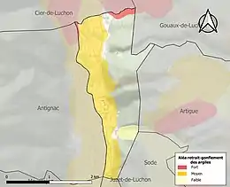 La commune est vulnérable au risque de mouvements de terrains constitué principalement du retrait-gonflement des sols argileux[33]. Cet aléa est susceptible d'engendrer des dommages importants aux bâtiments en cas d’alternance de périodes de sécheresse et de pluie. 47,1 % de la superficie communale est en aléa moyen ou fort (88,8 % au niveau départemental et 48,5 % au niveau national). Sur les 79 bâtiments dénombrés sur la commune en 2019, 71 sont en aléa moyen ou fort, soit 90 %, à comparer aux 98 % au niveau départemental et 54 % au niveau national. Une cartographie de l'exposition du territoire national au retrait gonflement des sols argileux est disponible sur le site du BRGM[34],[Carte 3].