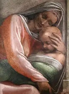La femme a les yeux fermés, prise par la tendre étreinte de son fils endormi en langes, en fait beaucoup plus âgé qu'un nouveau-né. Le sein dépasse toujours de la robe, rappelant l'allaitement qui vient de se terminer : par le passé, le détail, jugé peu approprié, a été masqué par une retouche qui a été supprimée lors de la récente restauration. Sa robe est composée d'une longue tunique rouge avec un voile vert terne, qui tombe également sur ses épaules. Elle a un manteau rose sur les jambes. L'emmaillotage du bébé est d'un vert plus intense que celui du voile de la mère, et blanc. Le groupe mère-enfant est parmi les plus doux de la série et contraste fortement, par l'attitude et les tons chromatiques, avec le vieillard à droite, représenté de profil, assis, une main sur le socle et de l'autre tenant un bâton où une tête barbue ressemble à son portrait. Il est tout penché, avec une barbe blanche qui se projette curieusement vers l'avant, et un regard qui exprime la colère. Il porte une courte tunique jaune sur un pantalon et des sandales roses ; sur la tête, il a un bonnet blanc, et sur le dos, il tient un fardeau ou un chapeau blanc à larges bords, tandis que sa ceinture avec une fiole suspendue, est nouée à la taille. Une écharpe grise lui tombe sur la jambe et s'enroule autour du bâton. Ces objets permettraient de l'identifier comme pèlerin. Bien que Michel-Ange ait caractérisé la figure comme celle d'un vieil homme, avec un visage ridé et une barbe blanche, il n'a pas renoncé à le doter d'un corps musclé et souple, comme on le voit bien dans les jambes qui sont athlétiques.