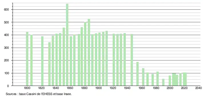 L'évolution du nombre d'habitants est connue à travers les recensements de la population effectués dans la commune depuis 1800. Pour les communes de moins de 10 000 habitants, une enquête de recensement portant sur toute la population est réalisée tous les cinq ans, les populations légales des années intermédiaires étant quant à elles estimées par interpolation ou extrapolation[7]. Pour la commune, le premier recensement exhaustif entrant dans le cadre du nouveau dispositif a été réalisé en 2004[8].