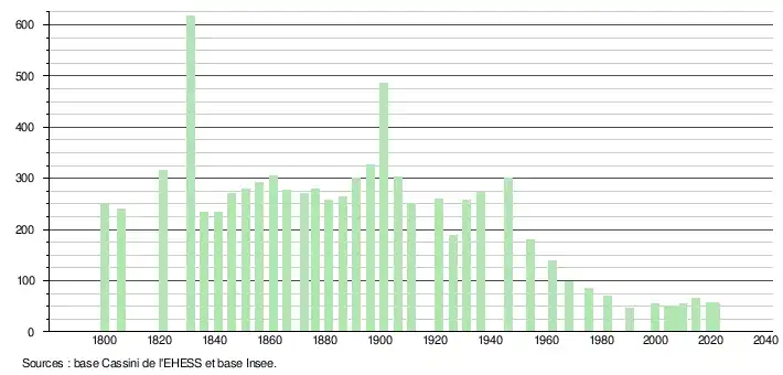 L'évolution du nombre d'habitants est connue à travers les recensements de la population effectués dans la commune depuis 1800. Pour les communes de moins de 10 000 habitants, une enquête de recensement portant sur toute la population est réalisée tous les cinq ans, les populations légales des années intermédiaires étant quant à elles estimées par interpolation ou extrapolation[19]. Pour la commune, le premier recensement exhaustif entrant dans le cadre du nouveau dispositif a été réalisé en 2004[20].