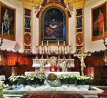- Sanctuaire de la Madonna del Santissimo Sacramento - Non loin de l'ancien hôtel de ville, se trouve le sanctuaire dédié à Marie. C'est l'église des "Pères sacramentels" de la "Congrégation du Saint-Sacrement" qui rappelle l'œuvre et la spiritualité de Saint Pierre-Julien Eymard. Construit dans l'ancien théâtre Virginia, il a été consacré le 8 décembre 1939 par l'évêque Luigi Ferri, qui est enterré dans cette église. Il souhaitait vivement que son diocèse de Ripatransone soit un lieu de culte dédié à l'Adoration perpétuelle. Dans le sanctuaire, en effet, le Saint-Sacrement de l'Eucharistie est exposé toute la journée à l'adoration des fidèles qui affluent en grand nombre. L'église, de plan moderne et rectangulaire, est divisée en trois nefs. Le mur arrière de l'abside, derrière l'autel, montre une grande mosaïque de l'artiste contemporain d'origine hongroise Giovanni Hajnal. Il rappelle l'épisode évangélique de la Cène d'Emmaüs : la figure imposante et élancée du Christ ressuscité, entre l'émerveillement et l'étonnement des deux disciples, semble rejoindre la terre et le ciel, tandis qu'il donne l'Eucharistie sous les espèces du Pain rompu et du Vin, à l'arrière-plan apparaît la croix avec laquelle le Fils de Dieu offre le salut aux hommes par le sacrifice de son Corps de son Sang.