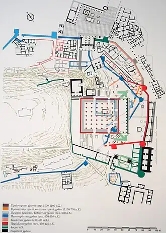 Les fouilles ont révélé des murs d'enceinte assez bien conservés, érigés depuis l'époque de Pisistrate jusqu'à l'Empire romain.